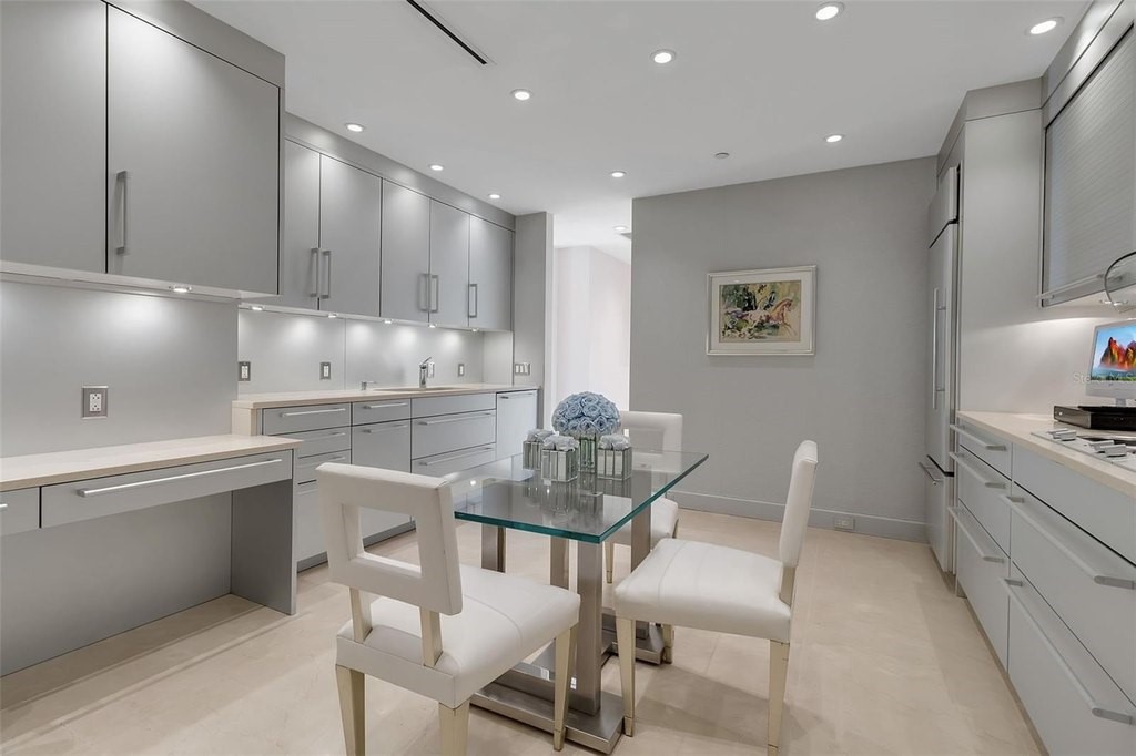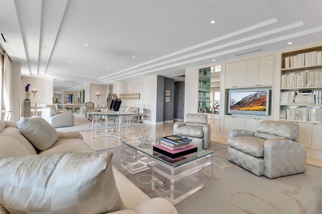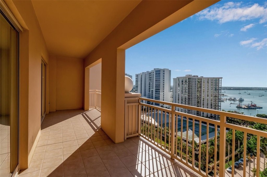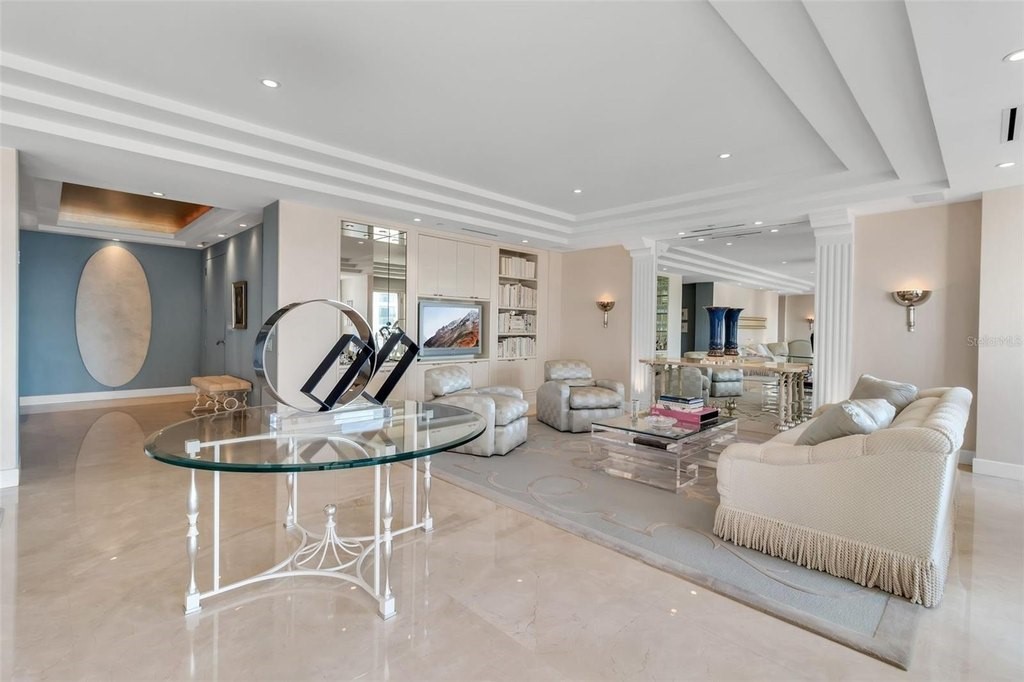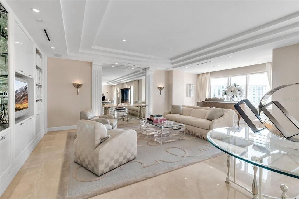 Perched high above exquisite Sarasota Bay, Ritz-Carlton Residences #1202 harmonizes a breathtaking display of scale, privacy, dramatic views, and exceptional design. Internationally renowned interior designer Geoffrey Bradfield paid the utmost attention to every detail as he masterfully crafted this sanctuary. The glamor unfolds gracefully as you enter the condos serene foyer featuring a beautifully architected gold-leafed ceiling, upholstered silk walls, and a custom lighting plan. Situated just off the foyer is a custom walk-in closet and a powder room finished with ultra-suede walls and modern stainless steel and glass pedestal sink. Crema Marfil marble flooring which runs throughout the condos public spaces leads you into a Grand Salon with a stunning tiered ceiling, gracious windows overlooking Marina Jack and the Ringling Causeway, fabulous lacquered cabinetry, and architectural moldings and accent columns. The large eat-in kitchen features sleek Poggenpohl cabinetry providing more than ample storage for any host or chef as well as a built-in desk area. The appliance package is top notch: Sub-Zero refrigerator/freezer, Gaggenau cooktop with a stainless steel and glass hood, Bosch double wall ovens, and a Miele dishwasher. The kitchen's custom lighting plan accents the textured walls and marble flooring. Both bedrooms offer marvelous custom appointments. The master suite features elegant lacquered custom cabinetry, silk upholstered walls, and lacquered moldings. The master baths ceiling is gold-leafed, the walls are marbled, and it is fitted with an oversized Kohler Jacuzzi tub, a glass-surround shower, and Venetian glass mirrors and vanities. The spacious walk-in closet also features custom millwork with lacquered columns and a Crema Marfil marble floor. The guest suite is similarly appointed with custom lacquered cabinetry, a large walk-in closet and a full bath with a large vanity. Throughout the condo, you will find opulent hardware and doors fitted with invisible sash hinges, linear air conditioning diffusers, and motorized window shades, as well as a spacious laundry room. The residence offers two large balconies perfect for viewing Sarasotas radiant sunsets. While living at the Ritz Carlton Residences you will enjoy a resort-style pool with a panoramic sun deck and private dock for convenient drop-off and pick-up. Additional resident amenities include secured climate controlled storage, a private residential entry separate from the hotel, and an elegantly appointed private club room. Hotel living offers access to in-room dining, 24-hour concierge, car valet service, a newly completed spa (2024), and access to popular dining venues Jack Dusty and Rufa. Gracefully positioned along Sarasotas scenic bayfront, ownership at 1111 Ritz-Carlton Drive #1202 presents an extraordinary opportunity for a life full of refinement and sophistication in a city featuring world-class beaches, stylish boutique shopping, acclaimed dining, and a vibrant cultural scene.